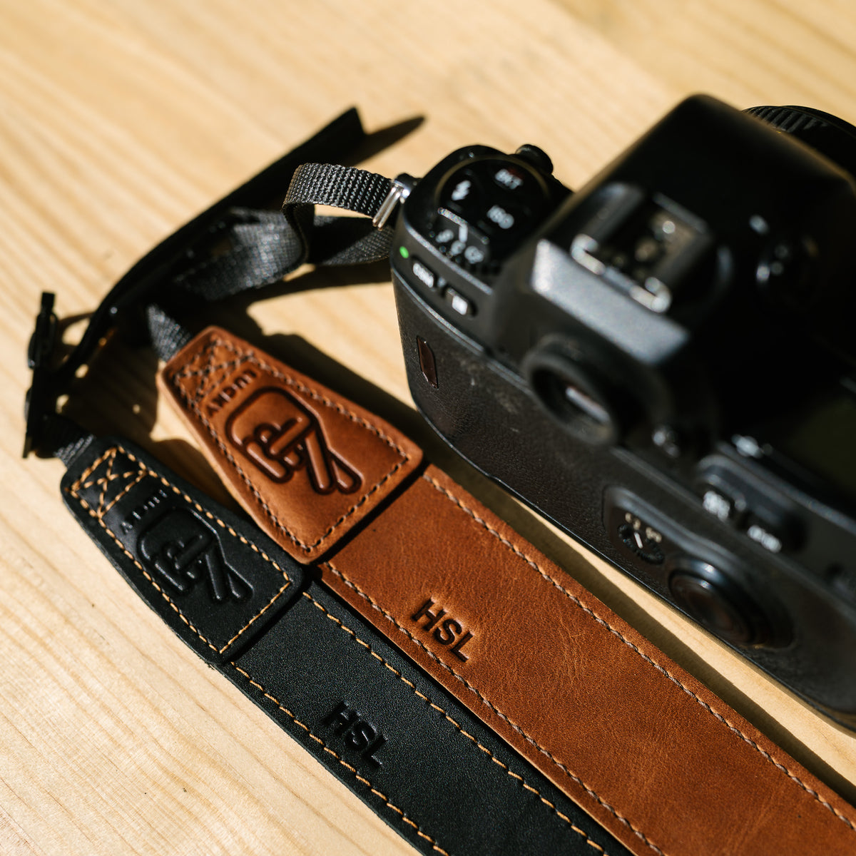 Range of leather camera straps all with different custom logos and personalisation